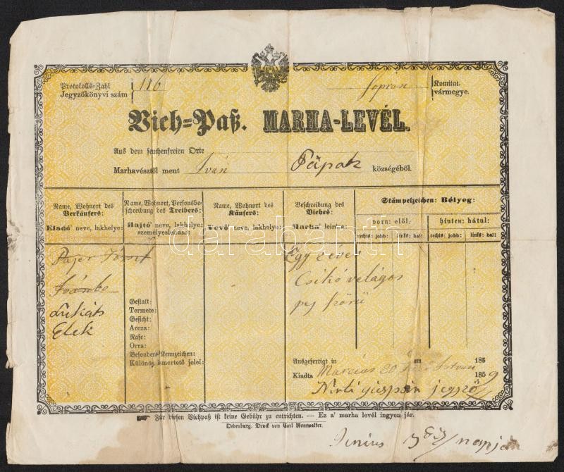 1858 Soprpn vármegye magyar és német nyelvű marhalevél https://www.darabanth.com/hu/302-Gyorsarveres/302.0/Festmeny-mutargy-papirregiseg-egyeb/Okmanyok~17/1858-Soprpn-varmegye-magyar-es-nemet-nyelvu-marhalevel~II1626014