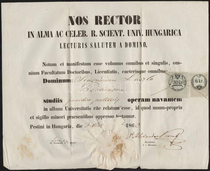 Leírás: 1862 Pesti jogi kari bizonyítvány 30+6kr illetékbélyeggel