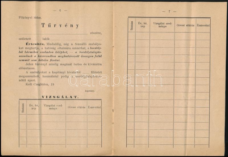 1887 Tűrvény (sic!) Bordélyosokról és kéjnőkről szóló szabályrendelet ... https://www.darabanth.com/hu/302-Gyorsarveres/302.0/Festmeny-mutargy-papirregiseg-egyeb/Okmanyok~17/1887-Turveny-sic-Bordelyosokrol-es-kejnokrol-szolo-szabalyrendelet-es-orvosi-igazola~II1624258