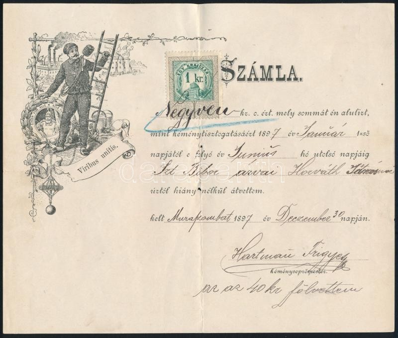 1897 Muraszombat díszes kéményseprő számla / Chimneysweep invoice https://www.darabanth.com/hu/302-Gyorsarveres/302.0/Festmeny-mutargy-papirregiseg-egyeb/Okmanyok~17/1897-Muraszombat-diszes-kemenysepro-szamla-Chimneysweep-invoice~II1625992