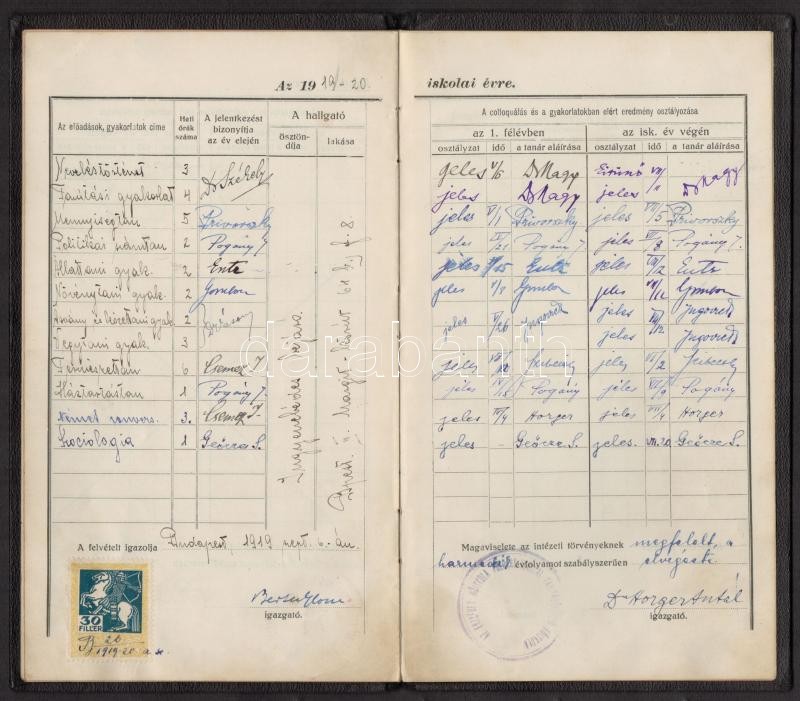 1917-1919 A budapesti állami Erzsébet Nőiskola tanítóképző intézete tanulójának leckekönyve, benne Horger Antal igazgató aláírásával, okmánybélyeggel, pecséttel