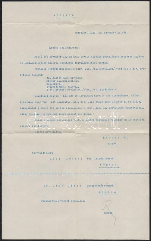 Leírás: 1928 Ravasz László püspök saját kezűleg szignált levele, katonai gyógyszerész ügyében