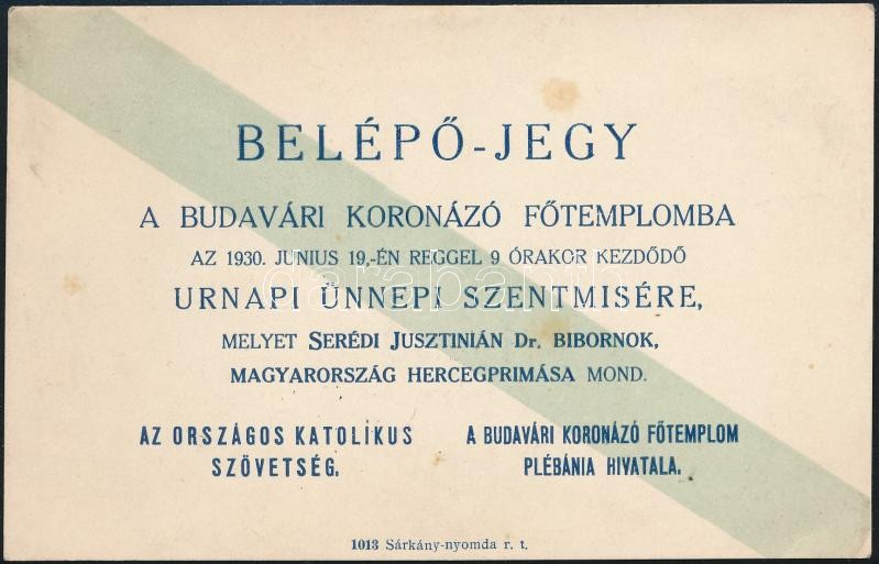 1930 Belépőjegy Budavári Koronázó Főtemplomba ünnepi misére. https://www.darabanth.com/hu/302-Gyorsarveres/302.0/Festmeny-mutargy-papirregiseg-egyeb/Okmanyok~17/1930-Belepojegy-Budavari-Koronazo-Fotemplomba-unnepi-misere~II1620673