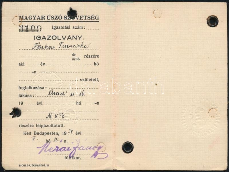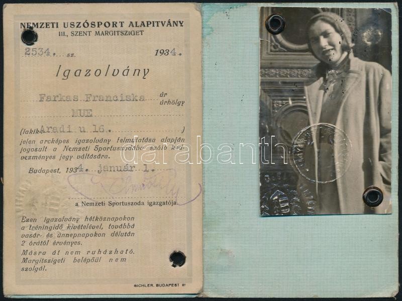 1934 Bp. Margitsziget, A Nemzeti Úszósport Alapítvány által kiállított... https://www.darabanth.com/hu/302-Gyorsarveres/302.0/Festmeny-mutargy-papirregiseg-egyeb/Okmanyok~17/1934-Bp-Margitsziget-A-Nemzeti-Uszosport-Alapitvany-altal-kiallitott-fenykepes-igazolvan~II1624275