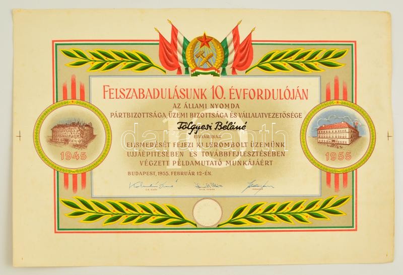 1955 az Állami Nyomda díszes jubileumi oklevele https://www.darabanth.com/hu/302-Gyorsarveres/302.0/Festmeny-mutargy-papirregiseg-egyeb/Okmanyok~17/1955-az-Allami-Nyomda-diszes-jubileumi-oklevele~II1625649