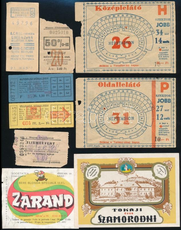Leírás: Kis okmány tétel: villamos- és buszjegyek, Népstadion belépőjegy + italcímkék