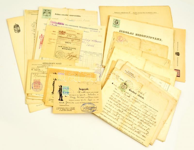 Leírás: Vegyes kis okmány tétel: különféle okmánybélyeges iratok, bizonyítványok, stb., magyar és külföldi vegyesen