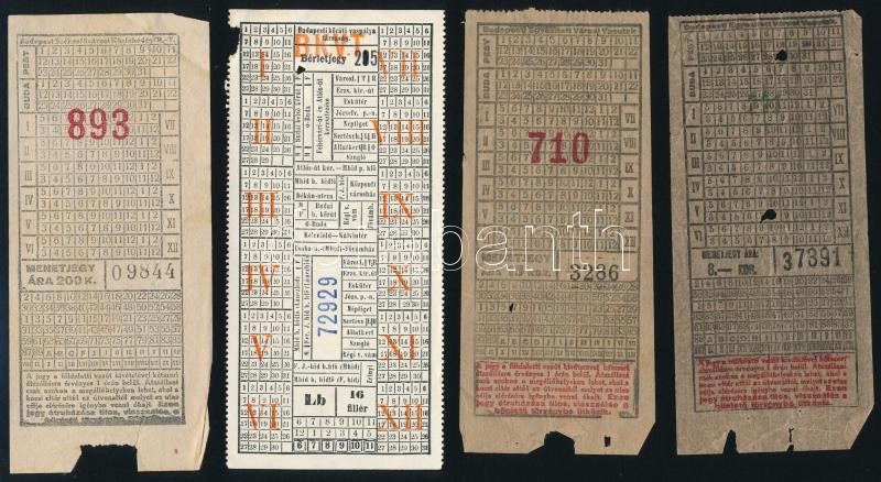 cca 1910-1920 Budapesti Közúti Vaspálya Társaság (BKVT) és Budapesti Székesfővárosi Közlekedési Rt. és Budapesti Egyesített Városi Vasutak jegyei, 4 db