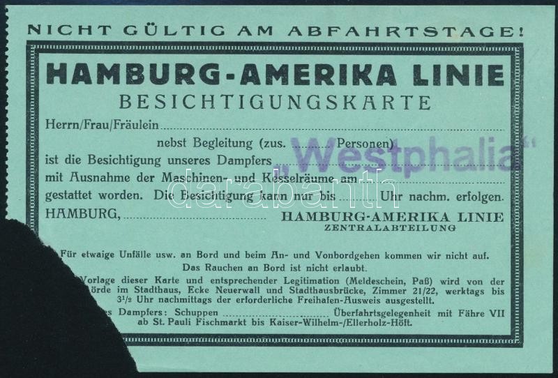 cca 1930 A Hamburg Amerika Linie Westphalia hajójára szóló jegy https://www.darabanth.com/hu/302-Gyorsarveres/302.0/Festmeny-mutargy-papirregiseg-egyeb/Okmanyok~17/cca-1930-A-Hamburg-Amerika-Linie-Westphalia-hajojara-szolo-jegy~II1624184