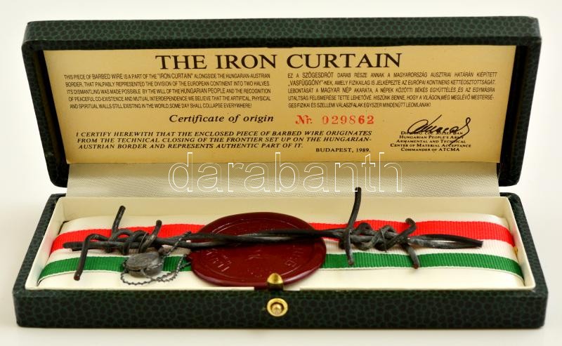 1989 Szögesdrót darab az osztrák-magyar határon húzódó vasfüggönyből (029862. sz.), tanúsítvánnyal, díszdobozban, 14×5 cm / Piece of barbed wire from the Iron Curtain, numbered (No. 029862), with certification, in case, 14×5 cm