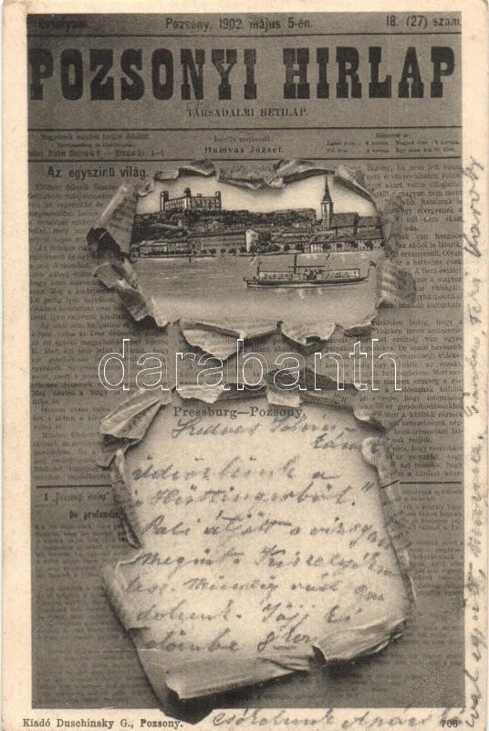 Leírás: Pozsony, Pressburg, Bratislava; vár, monitorhajó, Pozsonyi Hírlap montázs reklámlapja. Duschinsky G. kiadása / castle, Hungarian river guard ship, newspaper montage advertisement (EK)