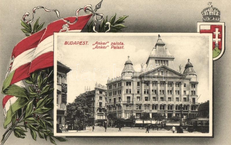 Budapest V. Anker palota, villamos, Magyar zászlós és címeres keret https://www.darabanth.com/hu/302-Gyorsarveres/302.0/Kepeslapok/Magyarorszag~300006/Budapest-V-Anker-palota-villamos-Magyar-zaszlos-es-cimeres-keret~II1623730