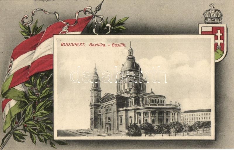 Budapest V. Bazilika. Magyar zászlós és címeres keret https://www.darabanth.com/hu/302-Gyorsarveres/302.0/Kepeslapok/Magyarorszag~300006/Budapest-V-Bazilika-Magyar-zaszlos-es-cimeres-keret~II1623725