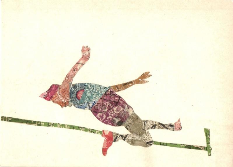 Leírás: Magasugró. Bélyegekből kivágott és összeragasztott képeslap. Budai nyomda / High jumper. Made out of stamps