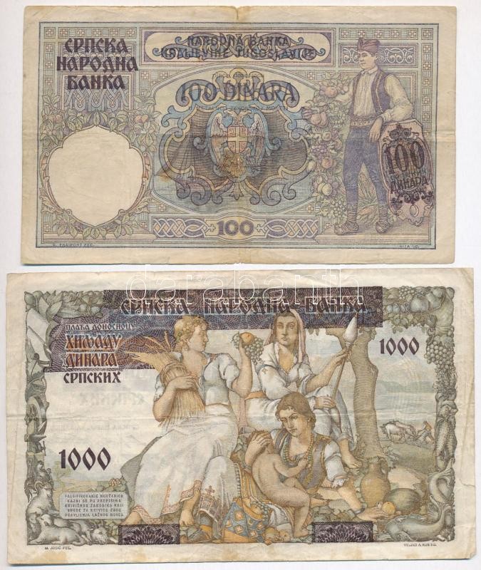 Serbia / German occupation 1941. 100 Dinara + 1000 Dinara both printed on Yugoslavian banknotes C:F,VG