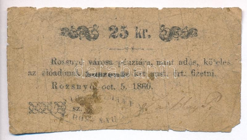 Leírás: Rozsnyó 1860. 25kr "Rozsnyó Város Pénztára", szövegben: "mint adós", értékjelzés 5mm magas T:IV,V
