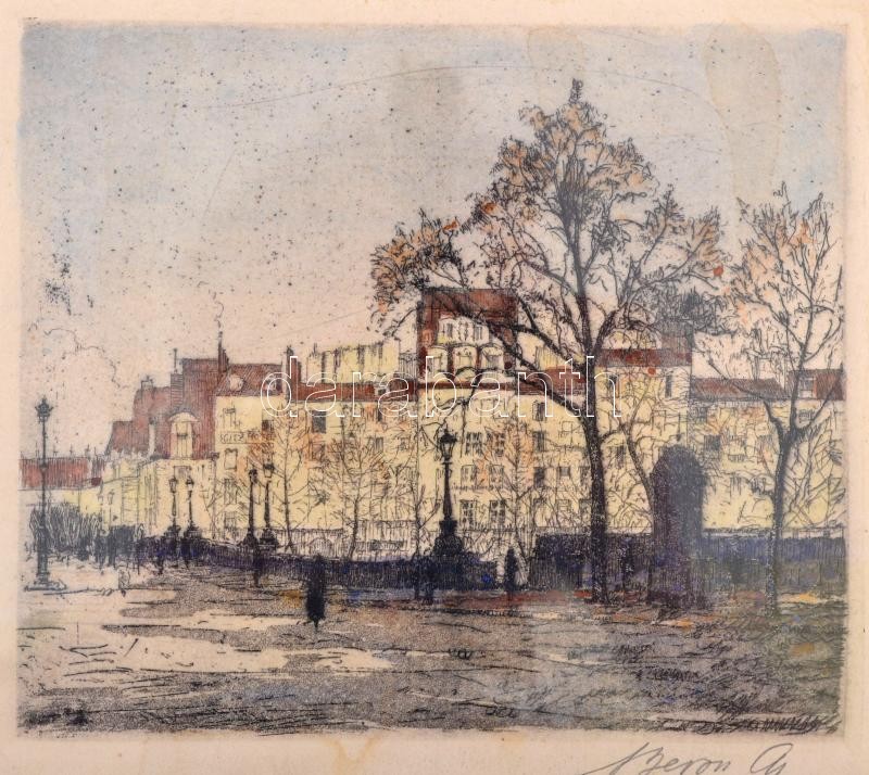 Leírás: Beron Gyula (1885-1971): Őszi sétány, színezett rézkarc, papír, jelzett, üvegezett fa keretben, 15×17 cm