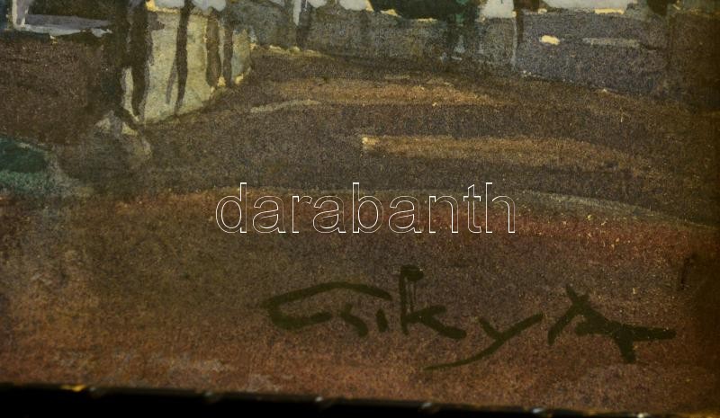 Leírás: Csiky András (1894-1971): Utcarészlet. Akvarell, papír, jelzett, üvegezett keretben, 17×20 cm