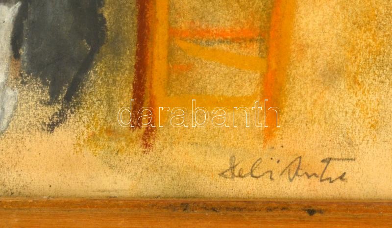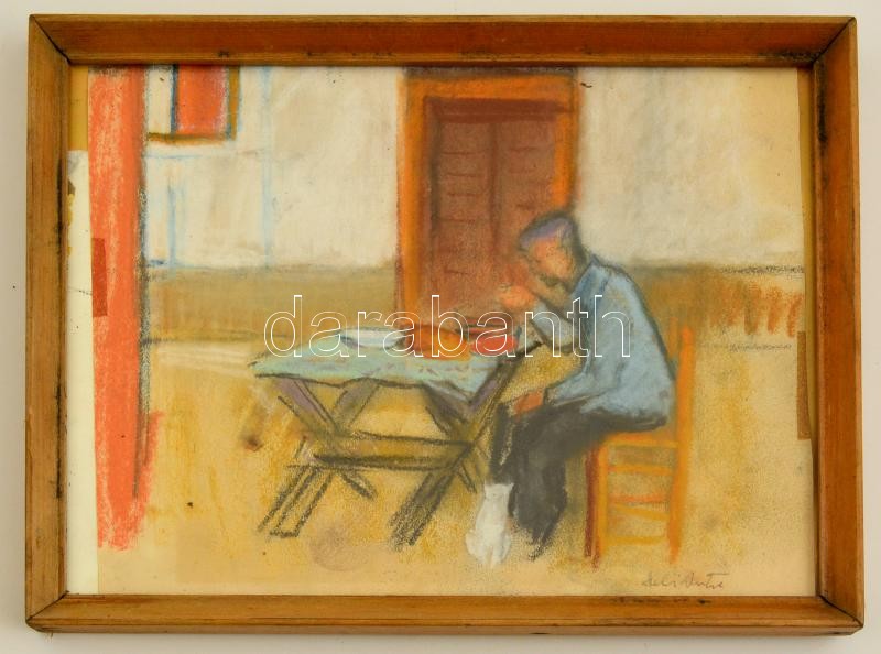 Leírás: Deli jelzéssel: Asztalnál. Pasztell-szén, papír, üvegezett keretben, 22×29 cm
