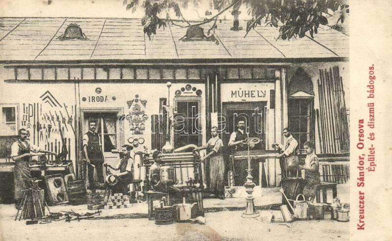Orsova, Kreuzer Sándor épület és díszmű bádogos műhelye, iroda, munkás... https://www.darabanth.com/hu/303-Gyorsarveres/303.0/Kepeslapok/Erdely~200006/Orsova-Kreuzer-Sandor-epulet-es-diszmu-badogos-muhelye-iroda-munkasok-az-udvaron-build~II1491155