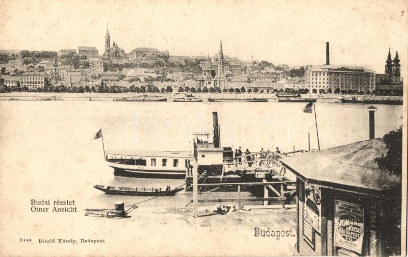 Leírás: Budapest, Budai látkép a pesti rakpartról, Batthyány tér, Sigmund József reklámja. Divald Károly 14. (b)