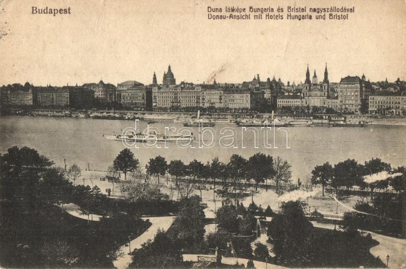 Leírás: Budapest, Dunai látkép a Hungaria és Bristol nagyszállodákkal, gőzhajó. Taussig kiadása (EK)