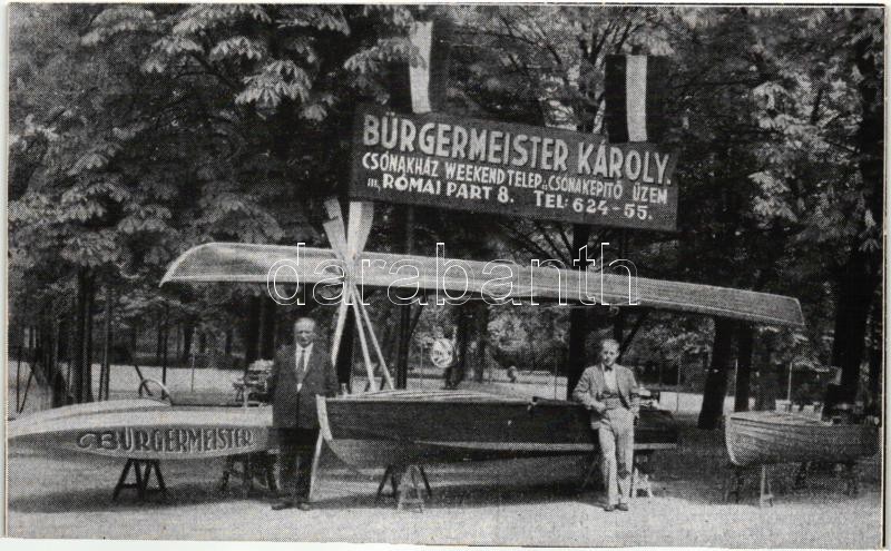 Leírás: Budapest III. Római part. Bürgermeister Károly Csónakház weekend telep és csónaképítő üzem, reklámlap. Germ Károly kiadása