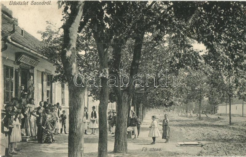 Leírás: Szond, Sonta; Fő utca, Freidinger Mór üzlete és saját kiadása / street view, shop (felületi sérülés / surface damage)