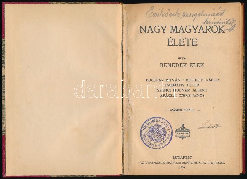 Benedek Elek: Nagy magyarok élete. Bocskay István, Bethlen Gábor, Pázmány Péter, Szenci Molnár Albert, Apáczai Csere János. Bp., 1906, Athenaeum. Átkötött félvászon-kötés, intézményi bélyegzővel.