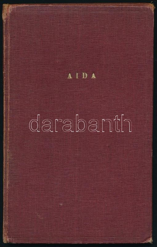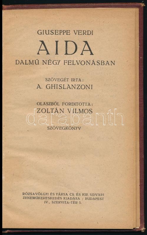 Guiseppe Verdi: Aida. Dalmű négy felvonásban. Szövegét írta A. Ghislanzoni. Fordította: Zoltán Vilmos. Bp., é.n, Rózsavölgyi és Társa Cs. és Kir. Udvari Zeneműkereskedés Kiadása. Kiadói egészvászon-kötés, kopottas borítóval.