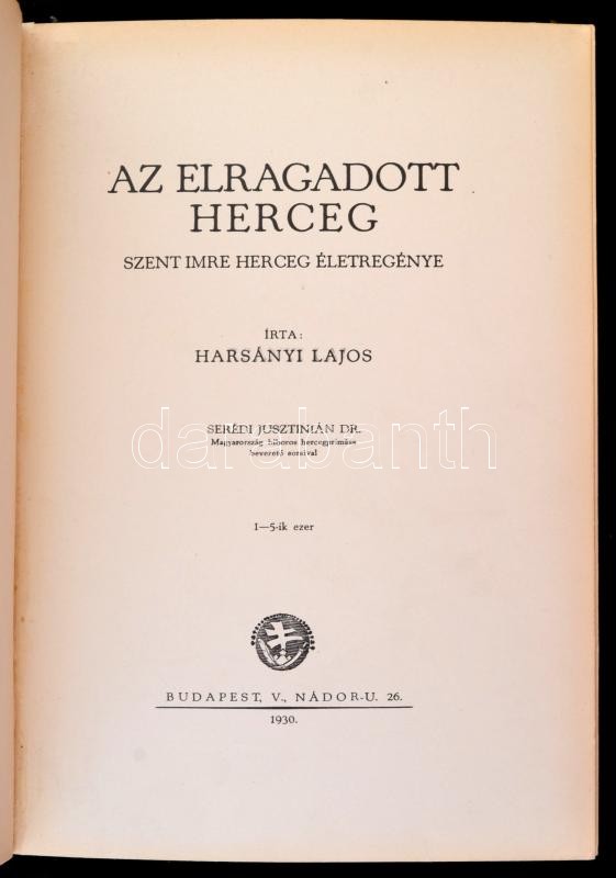 Harsányi Lajos: Az elragadott herceg. Szent Imre herceg életregénye. Serédi Jusztinián bevezetőjével. Jaschik Álmos borítójával, képeivel, és könyvdíszeivel illusztrálva. Budapest,1930,Hornyánszky V. Első kiadás. Kiadói aranyozott egészvászon kötésben, kissé kopottas borítóval, de egyébként jó állapotban.