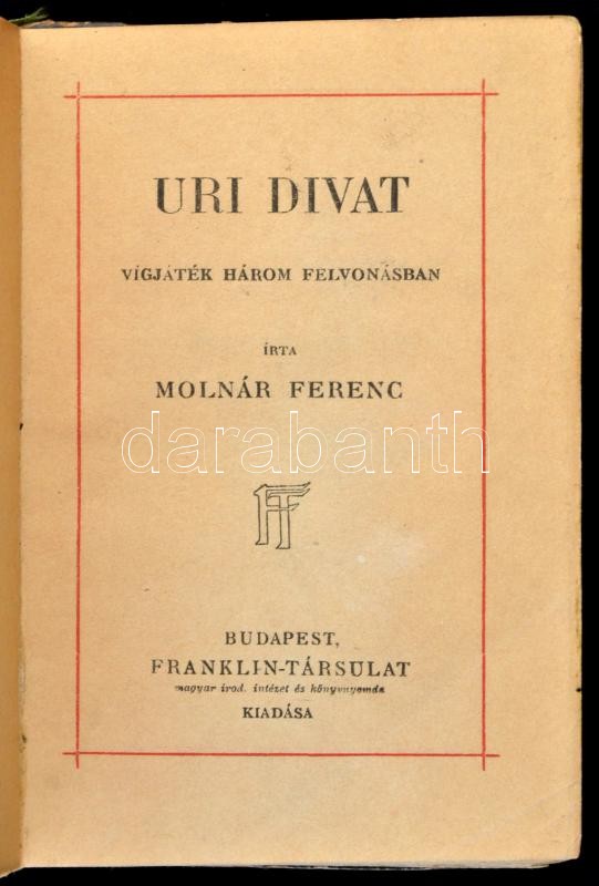 Molnár Ferenc: Uri divat. Vígjáték három felvonásban. Bp., 1917, Frank... https://www.darabanth.com/hu/303-Gyorsarveres/303.0/Konyvek/Konyvek-Egyeb-ritkasagok~500016/Molnar-Ferenc-Uri-divat-Vigjatek-harom-felvonasban-Bp-1917-Franklin-Korabeli-kopottas-f~II1614843