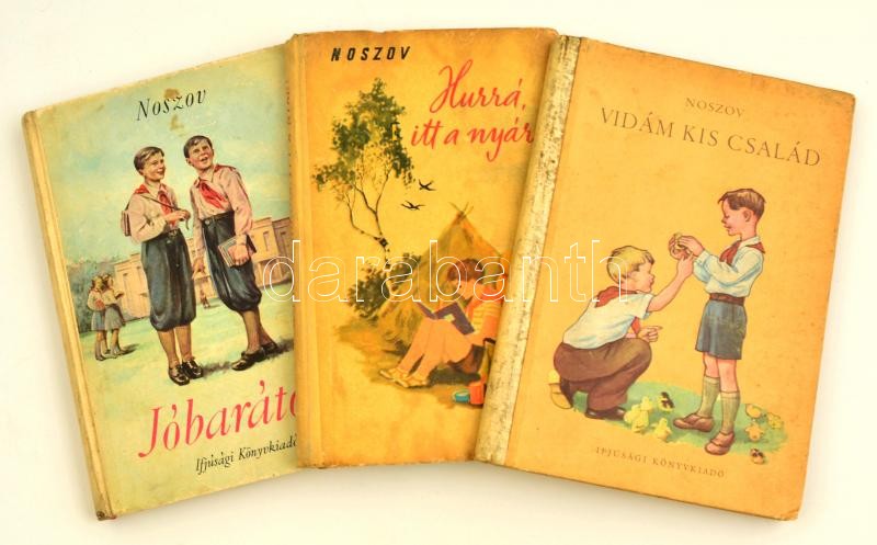 Noszov három könyve: Hurrá, itt a nyár! Fordította: Kertész Erzsébet. Rogán Ágnes rajzaival. Bp., 1960, Móra. Kiadói illusztrált félvászon-kötés, kopottas borítóval. Jóbarátok. Fordította: Szőllőssy Klára. Pozin rajzaival. Bp.,1953, Ifjúsági. Kiadói illusztrált félvászon-kötés, kopottas borítóval. Vidám kis család. Fordította: F. Kemény Márta. A belső rajzokat: J. Szemjonov. A fedelet Demjén Zsuzsa rajzolta. Bp.,1955, Ifjúsági. Kiadói illusztrált félvászon-kötés, kopottas borítóval.