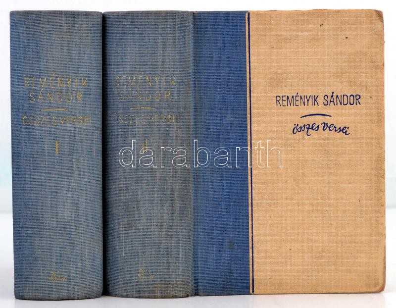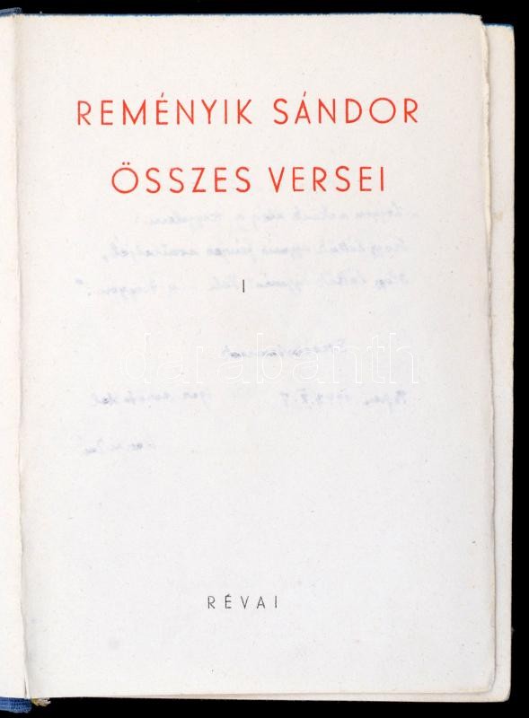Reményik Sándor összes versei I-II. kötet. Bp., 1943, Révai, 608+598 p. Kiadói félvászon-kötés, festett lapélekkel, kissé kopottas borítóval, az I. kötet fűzése elöl laza, ajándékozási sorokkal, két beragasztott nyomtatvánnyal Reményik Sándorról.