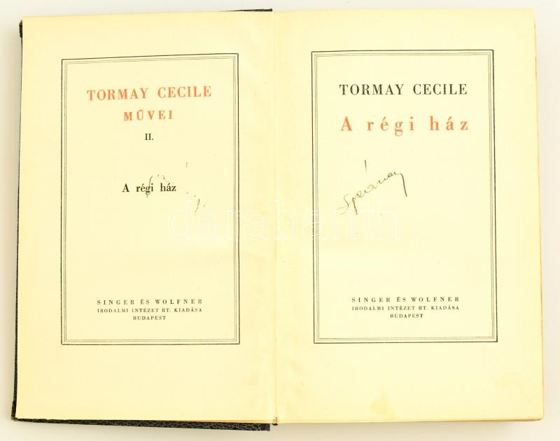 Tormay Cecile: A régi ház. Tormay Cecile művei II. kötet. Budapest, 19... https://www.darabanth.com/hu/303-Gyorsarveres/303.0/Konyvek/Konyvek-Egyeb-ritkasagok~500016/Tormay-Cecile-A-regi-haz-Tormay-Cecile-muvei-II-kotet-Budapest-1939-Singer-es-Wolfner-Ki~II1633028