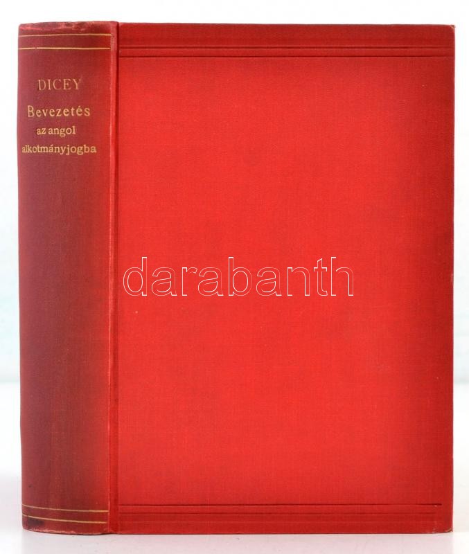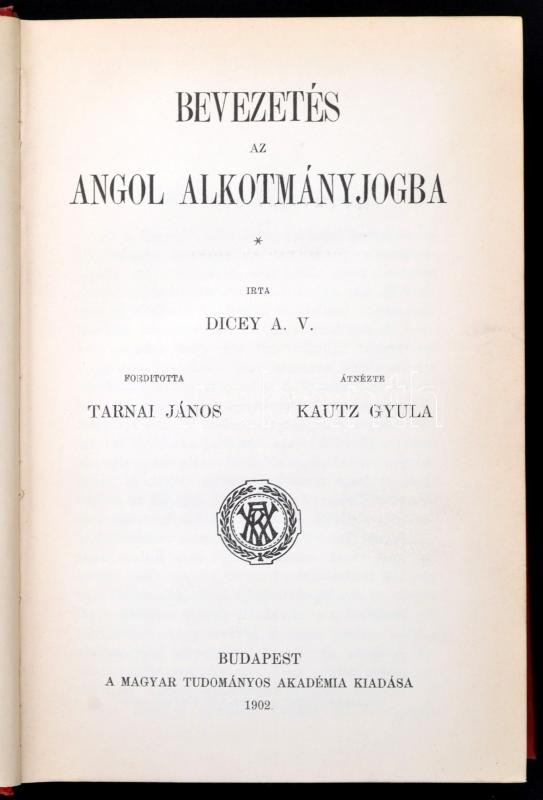 A. V. Dicey: Bevezetés az angol alkotmányjogba. Fordította Tarnai János. Átnézte Kautz Gyula. Bp., 1902, MTA. Korabeli egészvászon-kötés, foltos lapszélekkel. Jó állapotban.