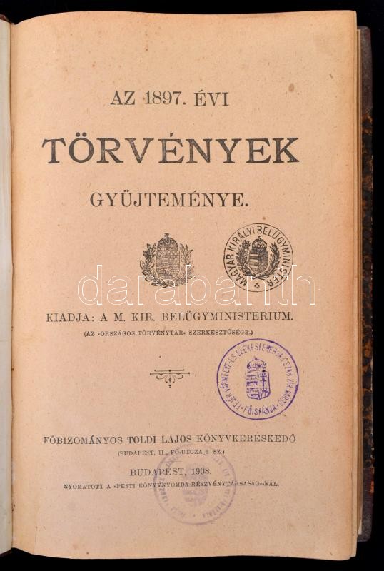 Az 1897. évi törvények gyüjteménye. Bp., 1908, M. Kir. Belügyministerium. Főbizományos Toldi Lajos Könyvkereskedő, Pest Könyvnyomda Rt., CVI+390 p. Korabeli kissé kopottas félbőr-kötés, intézményi bélyegzővel.