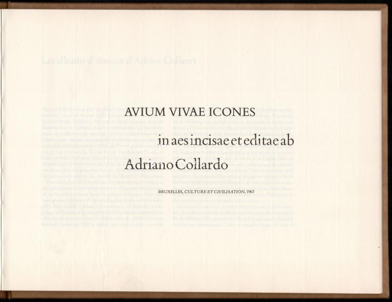 Adiano Collardo: Avium vivae icones. Brüsszel, 1967, Culture et Civilisation. Kiadói műbőr-kötés, francia nyelven. Reprint. / Leatherette-binding, in French language.