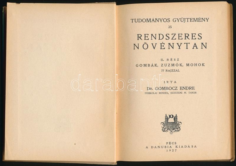 Dr. Gombocz Endre: Rendszeres növénytan II. rész: Gombák, zuzmók, mohok. Tudományos gyűjtemény 25. Pécs, 1927, Danubia. Kiadói kartonált papÃrkötés, sérült gerinccel, de egyébként jó állapotban.