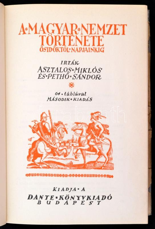 Asztalos Miklós- Pethő Sándor: A magyar nemzet története ősidőktől napjainkig. Bp.,(1934), Dante. Kiadói díszesen aranyozott egészvászon-kötésben, kiadói javított, részben hiányos illusztrált papír védőborítóban, jó állapotban.