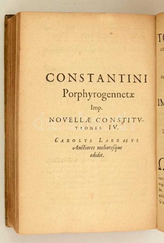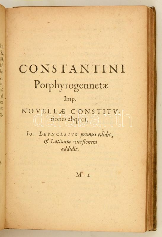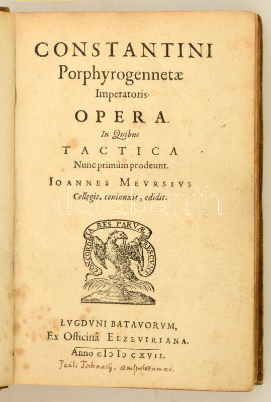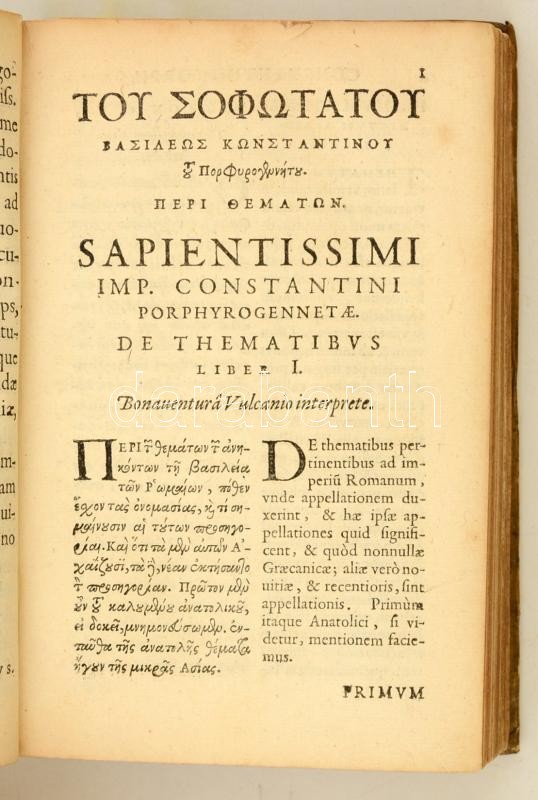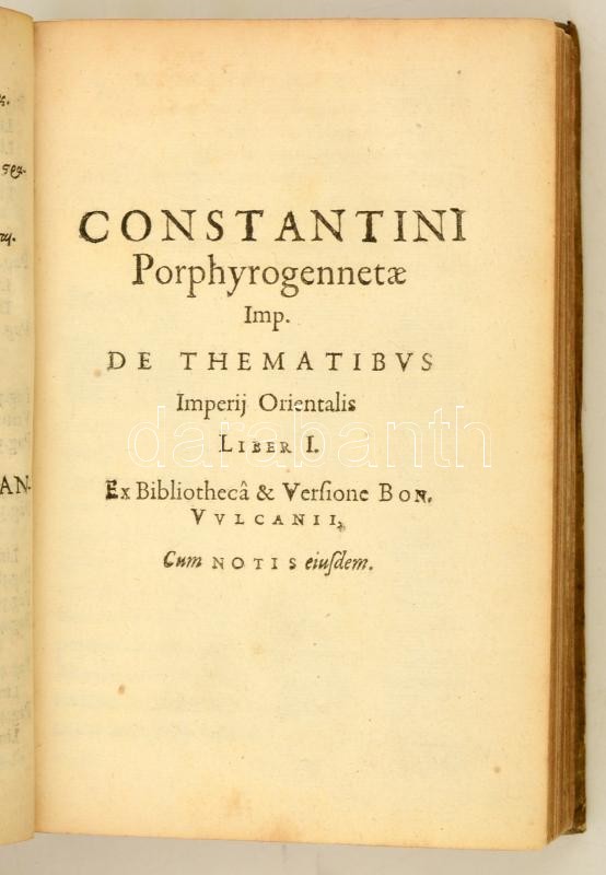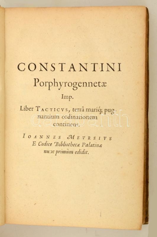 Hungarica: Constantinus Porphyrogenitus: Constantini Prophyrogennetae Imperatoris opera. (Tactica, Thematum I-II., Novellae Constitutiones XIII., Novellae IV.) Ioannes Meursius Collegit, coniunxit, edidit. Lugduni Batavorum, 1617. ex officina Elzeviriana. 8 sztl. lev. 58 l. 4 sztl. lev. 307 l. Korabeli egészpergamen-kötésben, latin és görög nyelven. Bíborbanszületett Konstantin (912-959) bizánci császár több kiemelkedő jelentőségű művet hagyott az utókorra. A tudományok és a művészetek iránti érdeklődését apjától, Bölcs Leótól örökölte. A kötet Bíborszanszületett Konstantin császárnak a magyarokkal is kapcsolatos, forrásértékű műveit tartalmazza. A szövegeket Moravcsik Gyula közölte modern kiadásban, fordításuk medig a Győrffy György szerkesztette "A magyarok elődeiről és a honfoglalásról" c. kötetben jelent meg. Ritka, becses hungaricum. Jó példány. / Work of Constantine VII Porphyrogenitus the 'Purple-born'. His historical and source works including the ones regarding Hungarians, in Latin and Greek language. In pergamin binding.