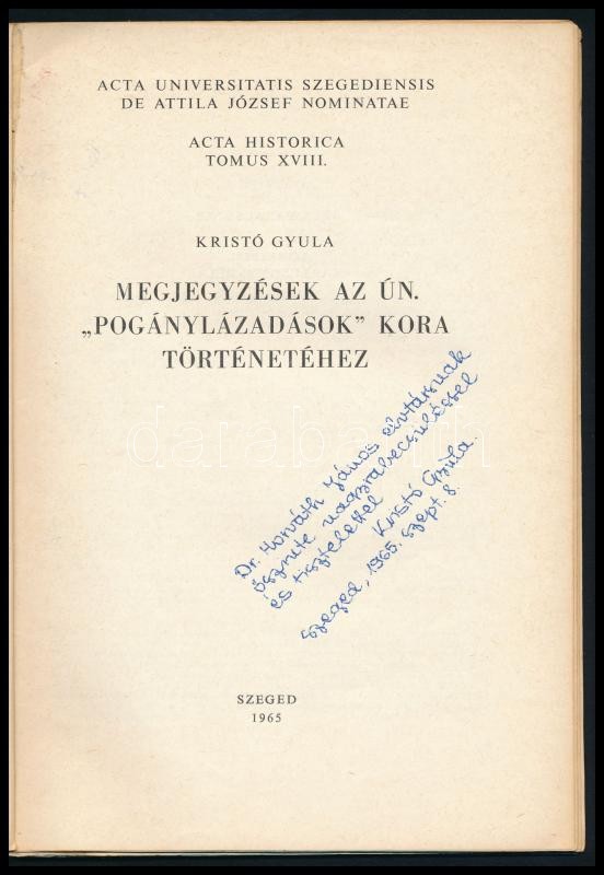 Kristó Gyula: Megjegyzések az ún. "pogánylázadások" kora történetéhez. Szeged, 1965, József Attila Tudományegyetem. Acta Historica XVIII. Kiadói papírkötés, kopottas gerinccel. Kristó Gyula dedikációjával Dr. Horváth Jánosnak.