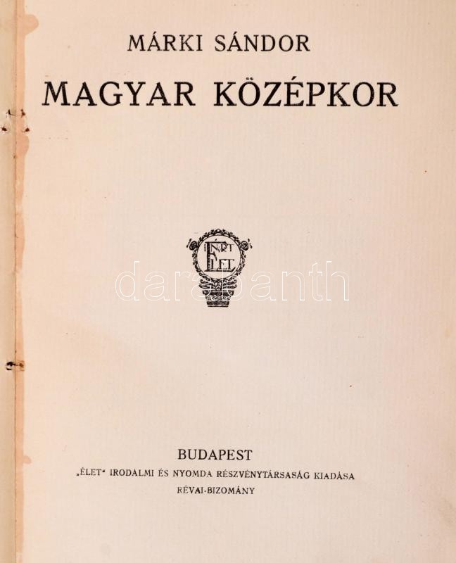 Márki Sándor: Magyar középkor. Bp., é.n.,"Élet" Irodalmi és ... https://www.darabanth.com/hu/303-Gyorsarveres/303.0/Konyvek/Konyvek-Tortenelem~500004/Marki-Sandor-Magyar-kozepkor-Bp-en-Elet-Irodalmi-es-Nyomda-Rt-Kiadoi-papirkotes-~II1570706