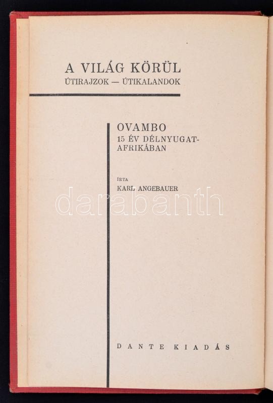 Karl Angebauer: Ovambo - 15 év Délnyugat-Afrikában. A világ körül - Útirajzok - útkalandok. Fordíotta Szirmay Józsefné. Budapest, (1931), Dante Könyvkiadó. Kiadói egészvászon kötés, fekete-fehér fotókkal és egy térképpel illusztrálva.