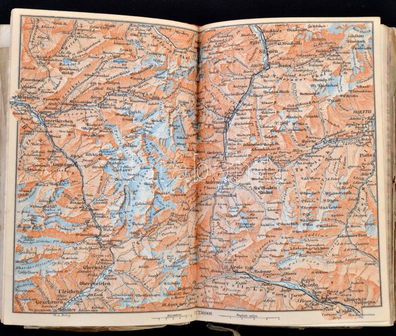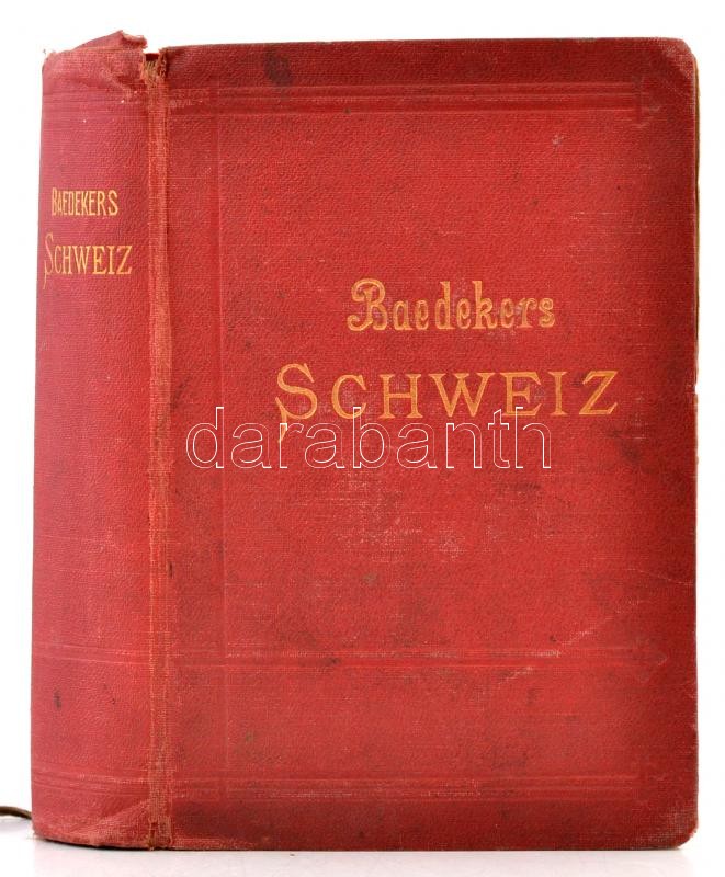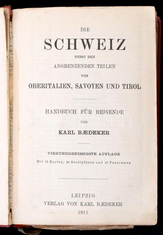 Karl Baedeker: Die Schweiz nebst den Angrenzenden Teilen von Oberitalien, Savoyen und Tirol. Handbuch für Reisiende. Leipzig,1911, Verlag von Karl Baedeker, XLII+583 p. 34. kiadás. Térképekkel illusztrálva, német nyelven. Kiadói aranyozott egészvászon kötés, festett lapélekkel, a gerince kissé sérült, egy kihajtható illusztráció szakadt, néhány kihajtható lap széle gyűrött. / Cloth binding, in german language. The spine little bit damaged, one illustation damaged.