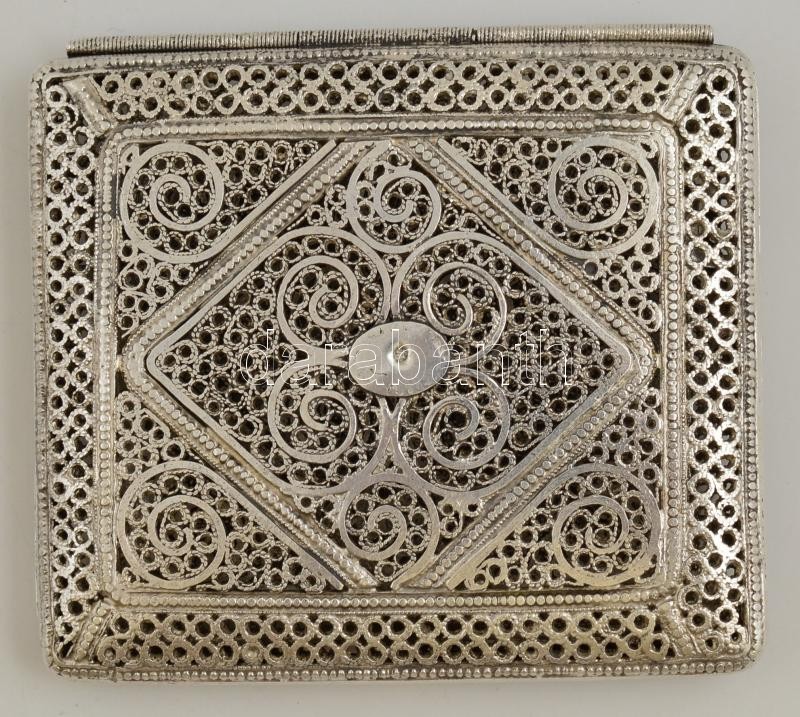 Leírás: Ezüst(Ag) filigrán cigarettatárca, jelzett, 7,8x8,8 cm, nettó: 157,3 g