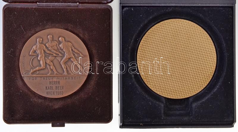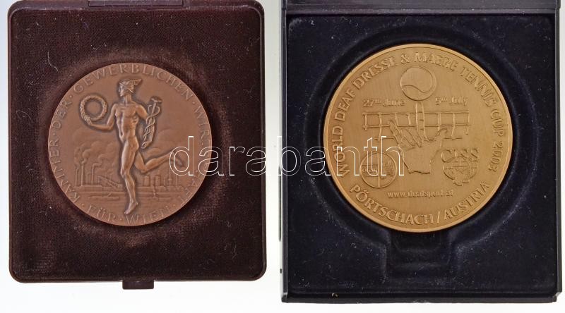 Ausztria 1980. "Bécsi Kereskedelmi Kamara" Br emlékérem dísztokban. Szign.: Grienauer (50mm) + 2003. "Dresse & Maere Siket Tenisz Világbajnokság - Pörtschach" aranyozott fém emlékérem műanyag tokban (60mm) T:2