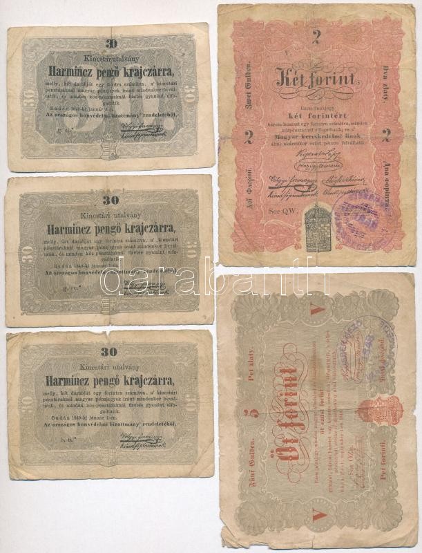 1848. 2Ft + 5Ft mindkettő hamis felülbélyegzéssel + 1849. 30kr (3x) T:... https://www.darabanth.com/hu/303-Gyorsarveres/303.0/Numizmatika/Magyar-bankjegyek~300007/1848-2Ft-plus-5Ft-mindketto-hamis-felulbelyegzessel-plus-1849-30kr-3x-TIII-~II1630087