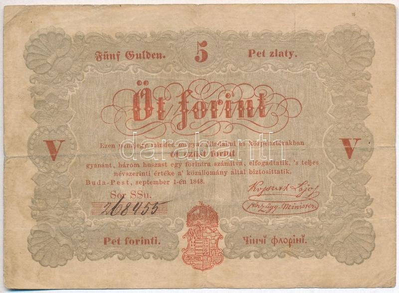 1848. 5Ft "Kossuth bankó" vörösesbarna nyomat T:III,III- Ada... https://www.darabanth.com/hu/303-Gyorsarveres/303.0/Numizmatika/Magyar-bankjegyek~300007/1848-5Ft-Kossuth-banko-vorosesbarna-nyomat-TIII-III-Adamo-G109~II1633160