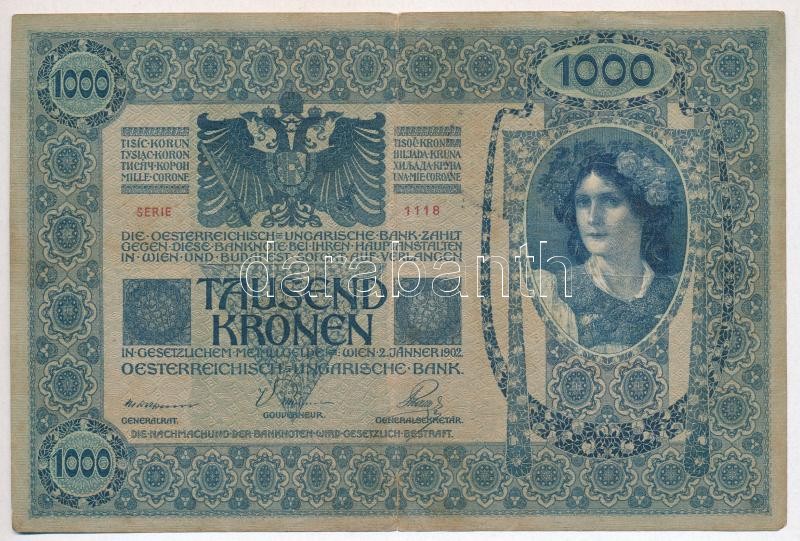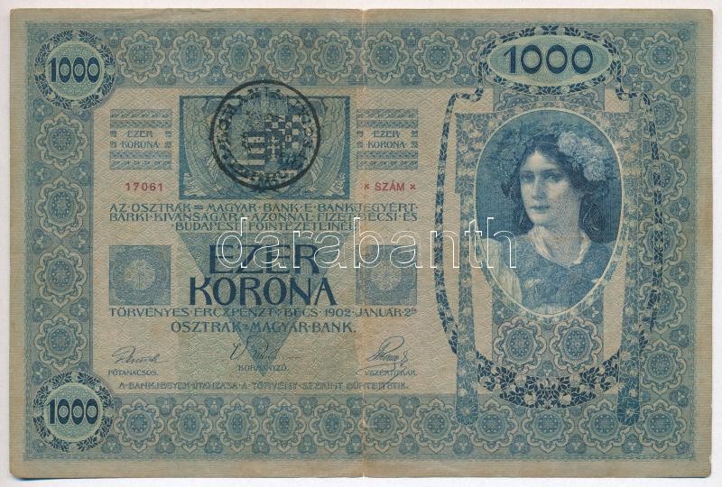 Leírás: 1902. 1000K (3x) mindhárom román felülbélyegzéssel T:III kis szakadás